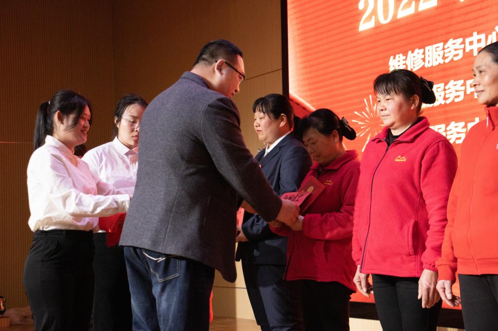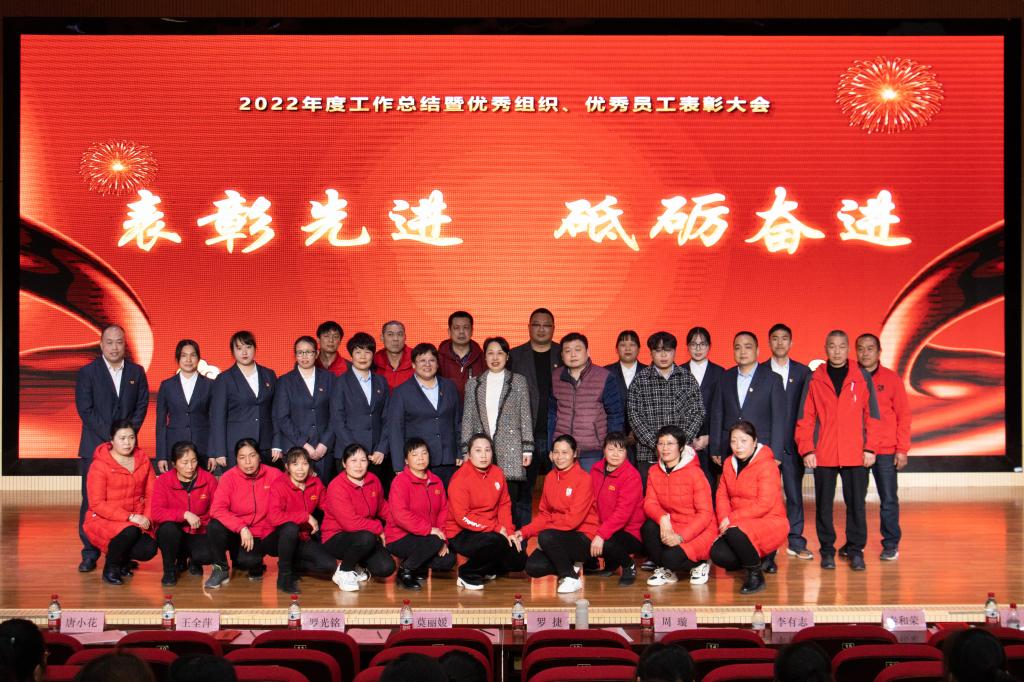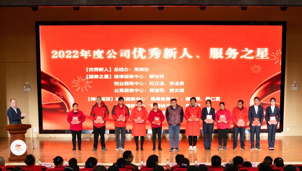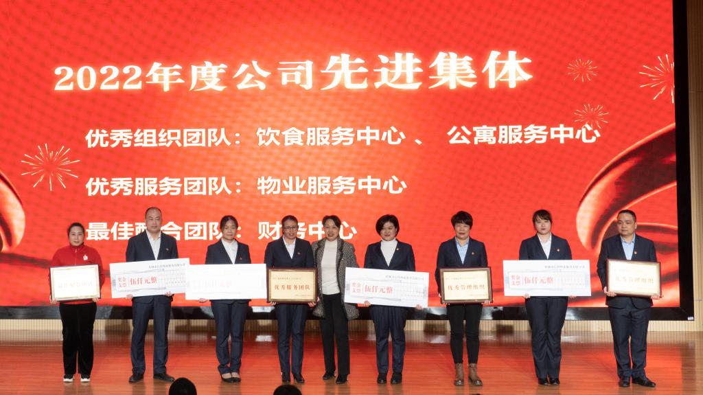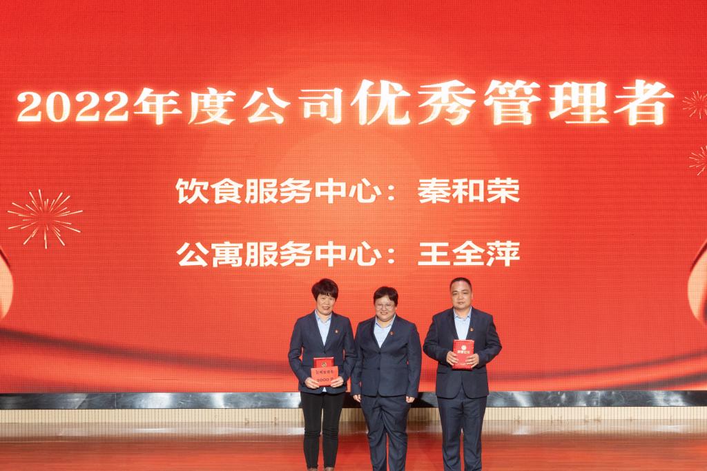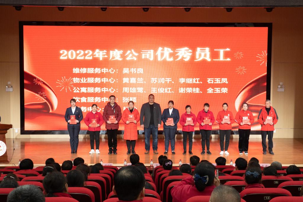 会议授予饮食服务中心、公寓服务中心“2022年度公司优秀组织”称号;授予物业服务中心、财务中心“2022年度公司优秀服务团队和最佳配合团队”荣誉称号;授予秦和荣、王全萍“2022年度公司优秀管理者”荣誉称号;授予吴书良等11名同志“2022年度公司优秀员工”荣誉称号;授予奉贻明等11名同志“2022年度公司服务之星、优秀新人”等荣誉称号,并进行了颁奖仪式。