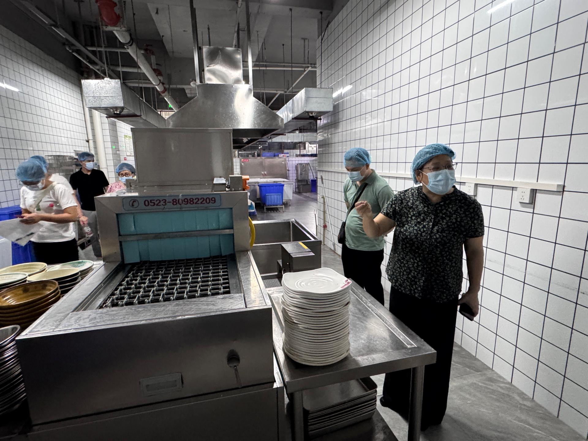 各学校参观了beat365食堂一楼餐厅的核心作业区域。在莫总的详细介绍下,各校的领导实地查看了beat365食堂台面排水设计、菜架盛水盘等“无水化”运作情况,通过直接将水导入地沟等手段,实现了操作间台面无水珠、地面无积水,有效提高食堂后厨卫生洁净程度,实现员工在厨房可穿布鞋工作。
