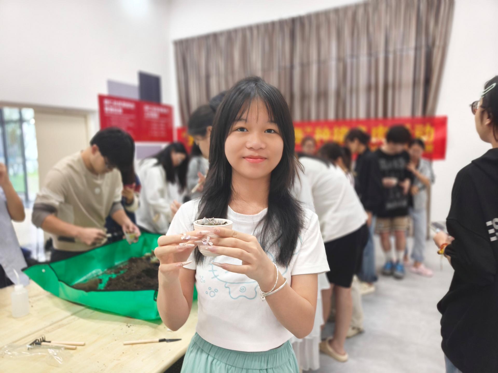 在活动现场,工作人员精心准备了多肉植物、花盆、土壤等种植材料,讲解了种植步骤和养花知识。学生们在种植过程中表现出了极高的热情,纷纷动手实践。电子工程学院卢佳佳老师表示:“希望通过这样的活动,让学生们亲近自然,感受种植的快乐,同时为校园环保贡献力量。”活动结束后,学生们纷纷表示,这次体验让他们对多肉植物有了更深的了解,也激发了他们对绿色生活的向往。他们在实践中体验到了种植的乐趣,也深刻感受到了劳动的价值。