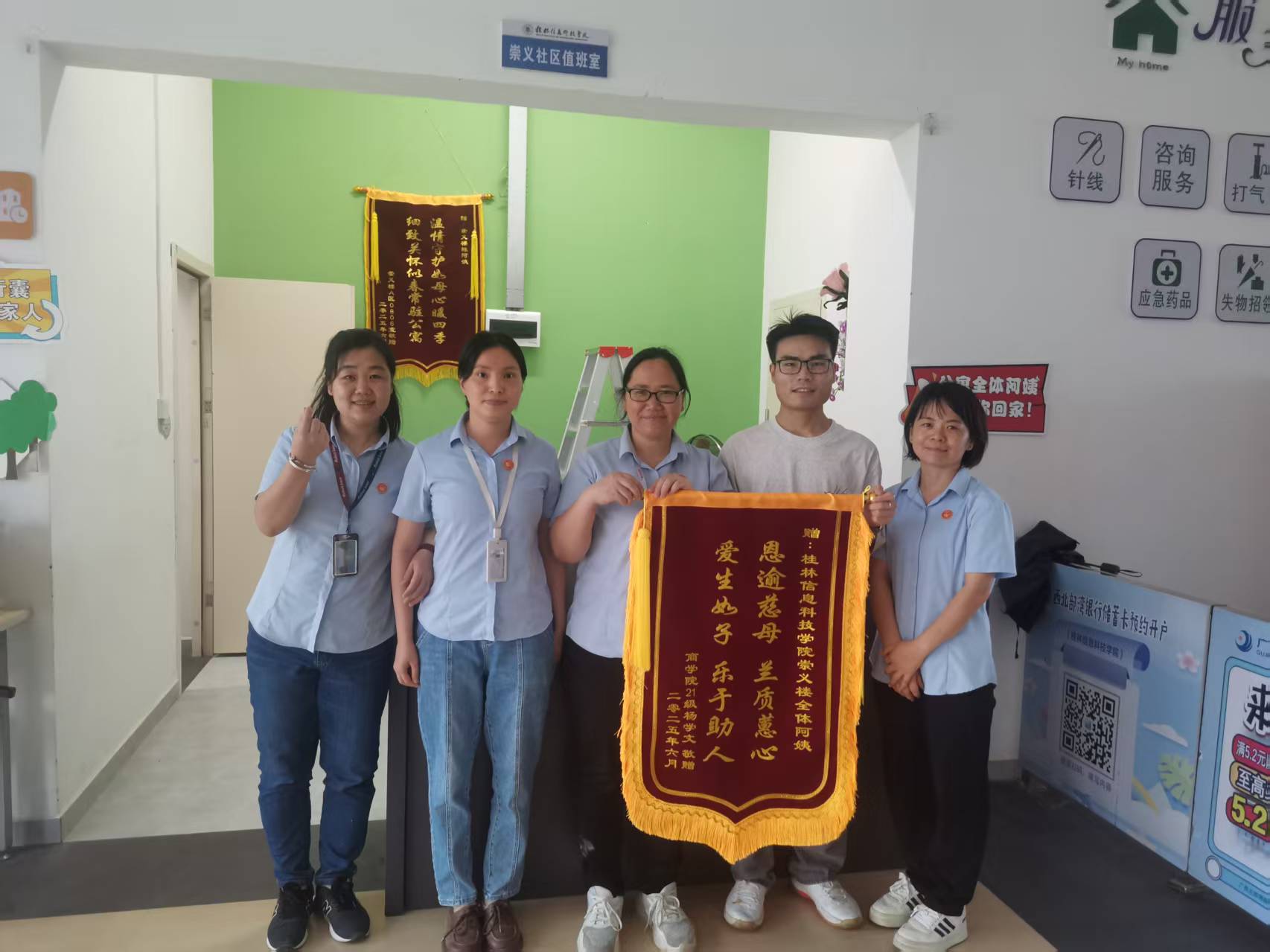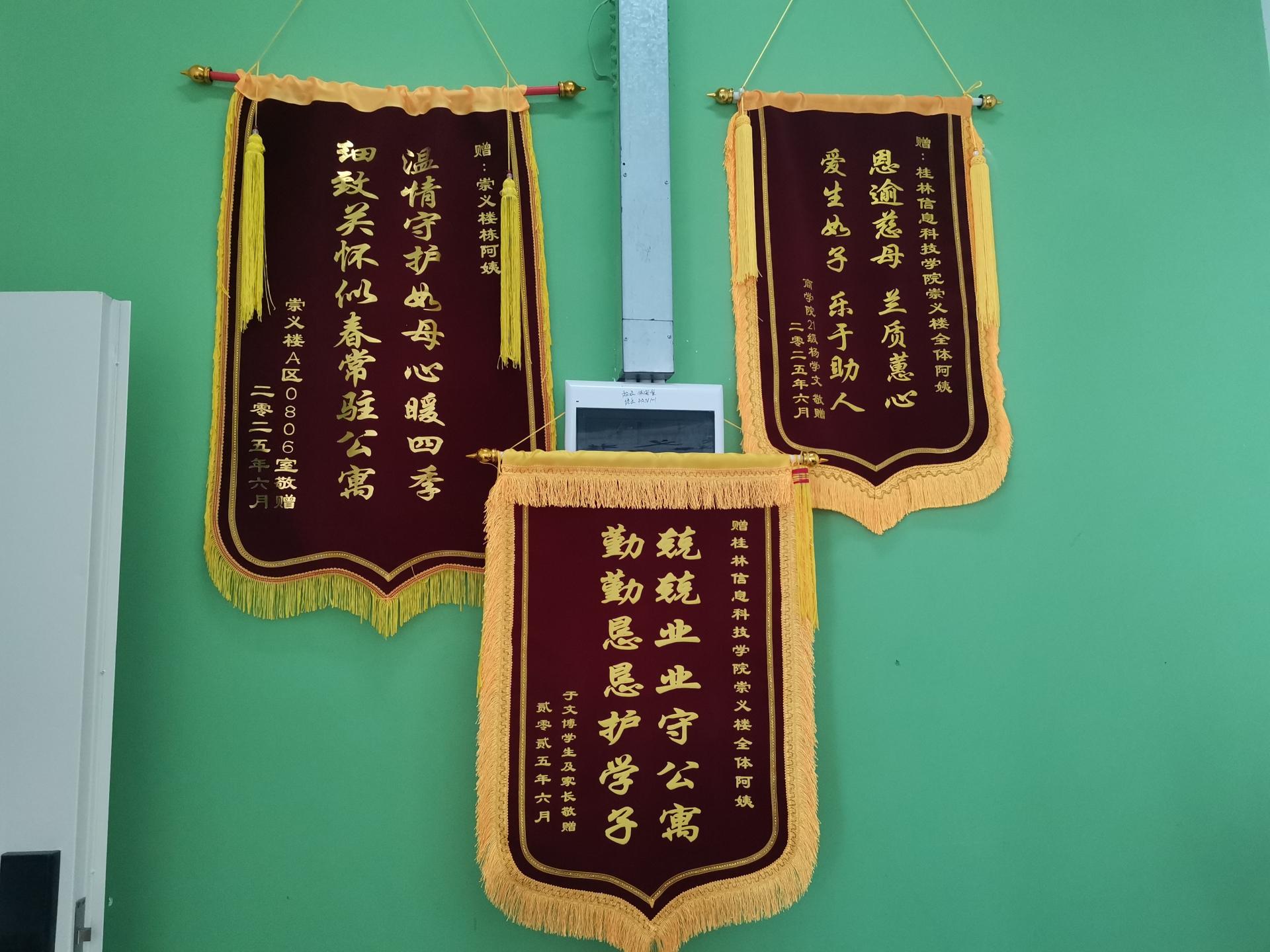近日,后勤服务处收到多位毕业生代表赠送的4面锦旗,学生以锦旗的方式,向后勤工作人员表达四年来服务保障的感激之情。锦旗上“温情守护如母心暖四季,细致关怀似春常驻公寓”,“春风化雨润学子,暖心如家胜亲人”的赠语,是广大毕业学子对后勤服务的充分肯定和切身感受,也是对今后后勤保障的鼓励和鞭策,更是后勤育人实践“开花结果”的集中体现。