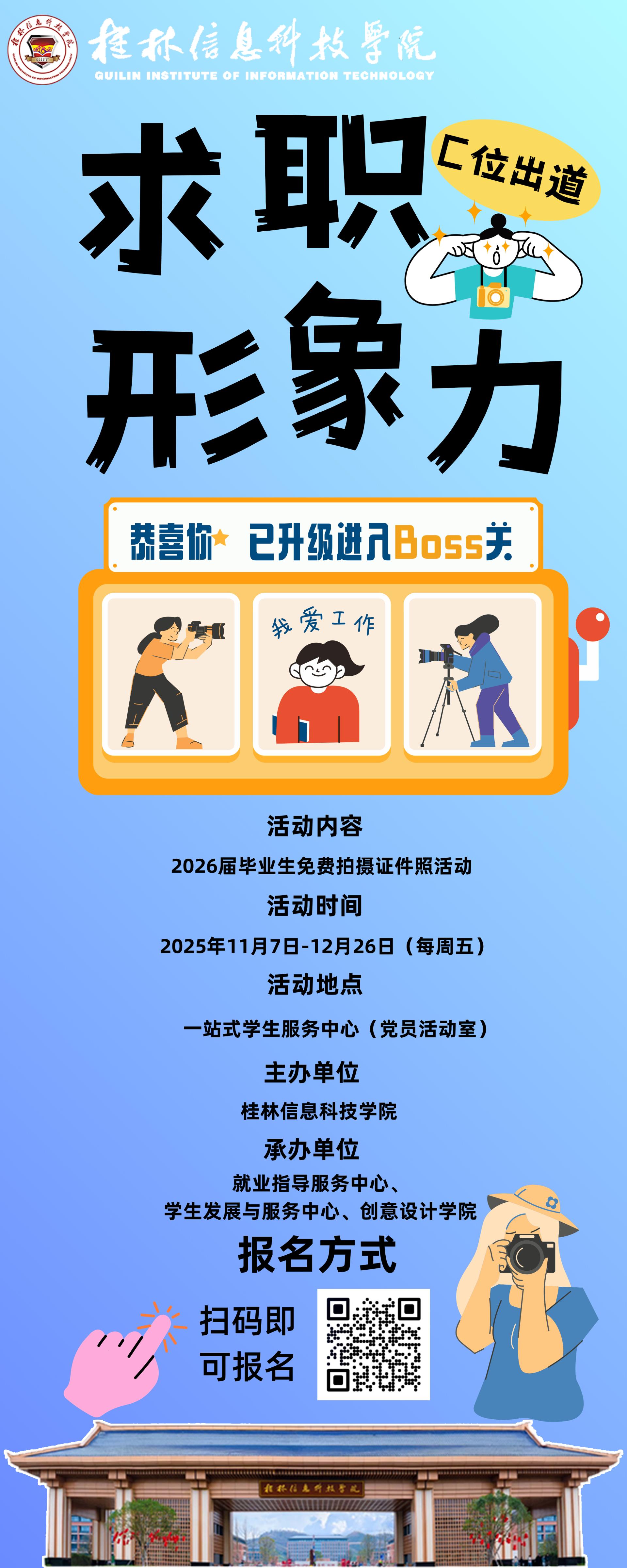 作为毕业季就业服务的重要环节,本次活动由就业指导服务中心、学生发展与服务中心及创意设计学院联合承办,面向全体2026届毕业生。活动时间为2025年11月7日启动,至12月底每周周五,地点设在一站式学生服务中心(党员活动室)。毕业生可通过线上预约报名,由师生组成的专业摄影团队提供拍摄服务,确保每位学生都能获得一张展现最佳精神风貌的优质证件照,为个人简历与求职材料增色添彩。