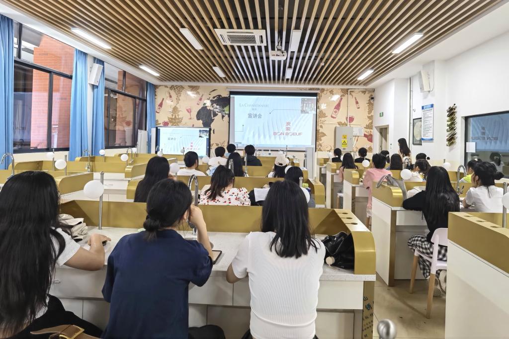 5月24日,外贸与外语学院邀请北京兰颂炭索餐厅在葡萄酒实验室F112召开校企联合培养企业宣讲会,宣讲会由国际商务专业教研室主任高宇主持,北京兰颂炭索餐厅主理人叶昕及主管宋嘉俊(beat3652023届毕业生校友)进行宣讲,2021级国际商务专业全体学生参加。