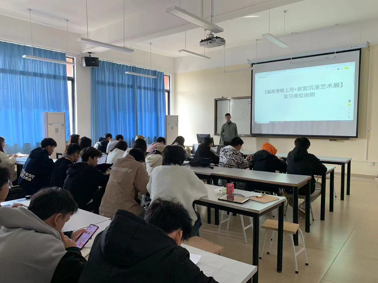 近日,深圳徐来科技传媒文化传播有限公司莅临我院,于创意设计学院E401教室隆重举办了一场招聘宣讲会。本次宣讲会汇聚了2021级动画专业的学生,旨在深化我院师生对深圳徐来科技传媒文化传播有限公司的全面了解,并深入剖析公司近期推出的《画游清明上河-故宫沉侵艺术展》项目。此举不仅为即将踏入社会的大三学生提供了优质的实习机会,同时也为企业选拔优秀人才搭建了一个高效的平台。