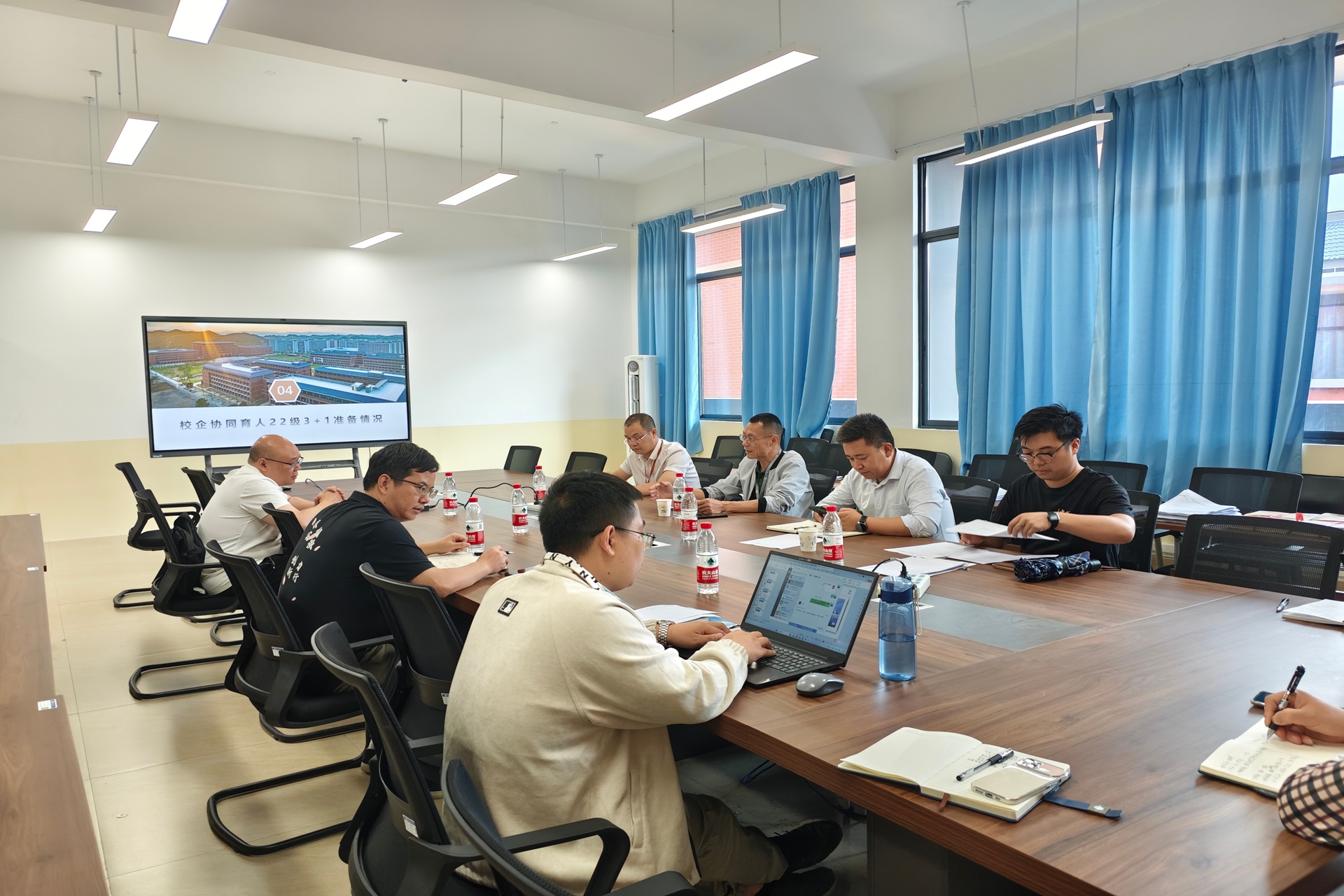 校领导一行在信息工程学院会议室B513-2进行座谈会,与学院负责人、指导教师进行座谈交流,检查基地的建设情况。在基地指导老师黄老师和许老师的介绍下,校领导深入了解基地运行模式、学生实习等方面的工作情况,对基地建设情况表示充分肯定,并现场就基地建设规划、教学资源整合、课程体系优化等提出了宝贵意见与改进建议。