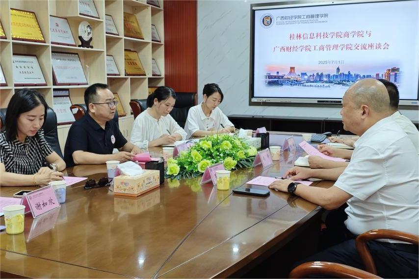 7月1日,商学院副院长罗志明及电子商务教研室主任赵凤燕、财务管理教研室主任刘凤英、人力资源管理教研室主任谢如欢、市场营销教研室副主任梁梅婷及人力资源管理教师代表朱苑苑赴广西财经学院工商管理学院开展交流调研活动。广西财经学院工商管理学院院长赵锋、副院长罗胜和科研秘书颜娟热情接待调研组,双方就新商科专业建设与传统专业数字化转型展开讨论。
