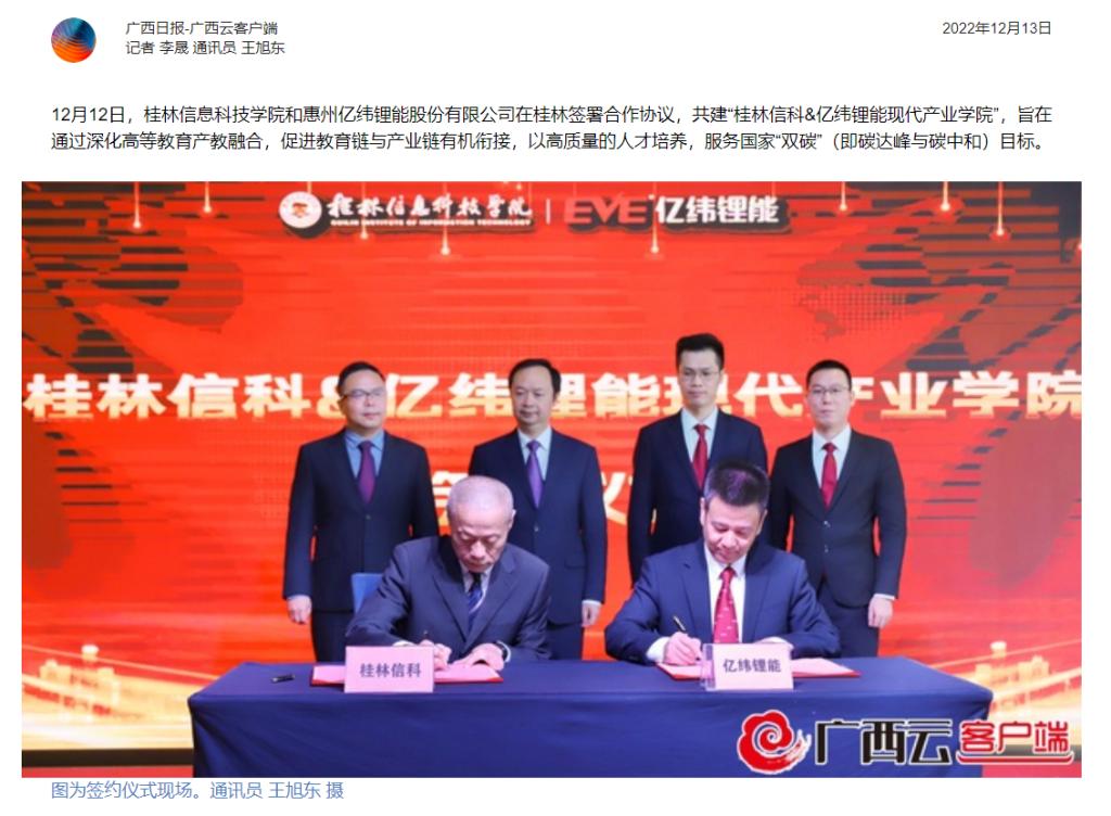12月12日,beat365官方网站和惠州亿纬锂能股份有限公司在桂林签署合作协议,共建“桂林信科亿纬锂能现代产业学院”,旨在通过深化高等教育产教融合,促进教育链与产业链有机衔接,以高质量的人才培养,服务国家“双碳”(即碳达峰与碳中和)目标。