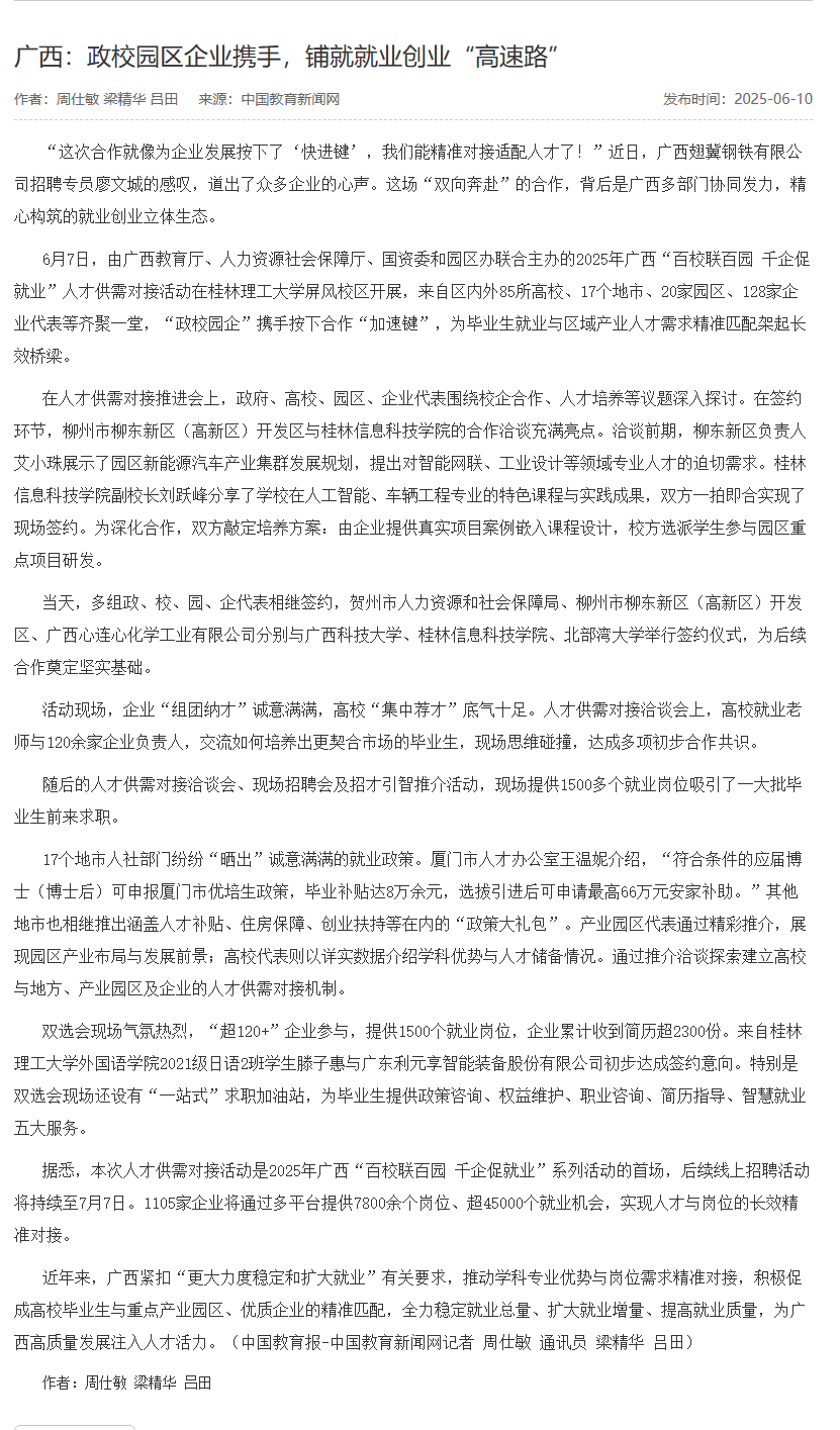 中国教育新闻网:广西:政校园区企业携手,铺就就业创业“高速路