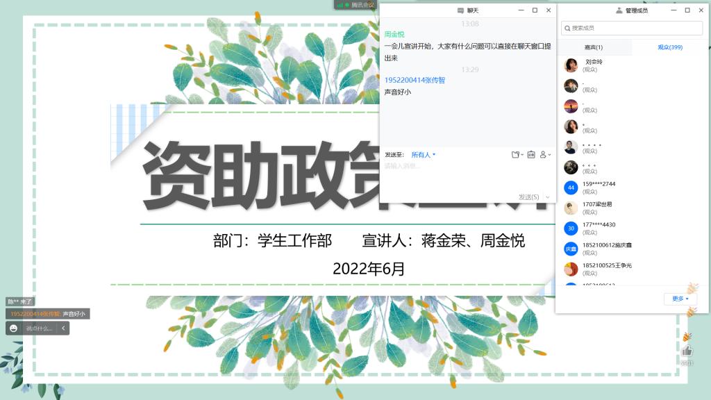 为有效宣传高校奖助学金和国家助学贷款等资助政策,开展好本年度学生资助工作,beat365于5月25日-6月10日召开了三场2022年资助政策线上宣讲会。本次会议由各二级学院资助老师主持宣讲,线上参与人数累计近900人。