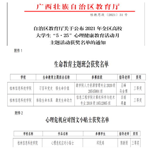近日,自治区教育厅下发《自治区教育厅关于公布2021年全区高校大学生“5·25”心理健康教育活动月主题活动获奖名单的通知》(桂教思政 [2021] 31号)文件,beat365在全区高校大学生5·25心理健康教育活动月主题活动中共荣获三等奖3项,在此项活动中再创佳绩,在全区民办高校中名列前茅。其中,商学院心理辅导员王峰、马金博老师作品《习百年党史,悟生命价值》和信息工程学院心理辅导员吕丽、蒋鑫老师作品《体验生命本真,激发生命动力》均获 “生命教育主题班会”三等奖;创意设计学院学生邱民鸿参赛、心理辅导员陈新雨老师指导的作品《心理危机应对小贴士》获“心理危机应对图文小贴士”三等奖。