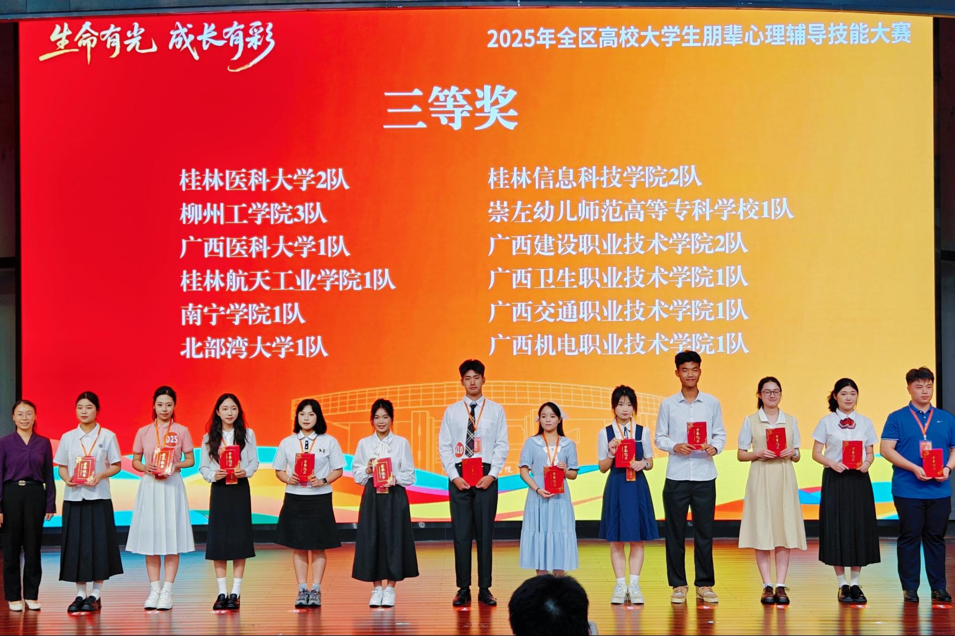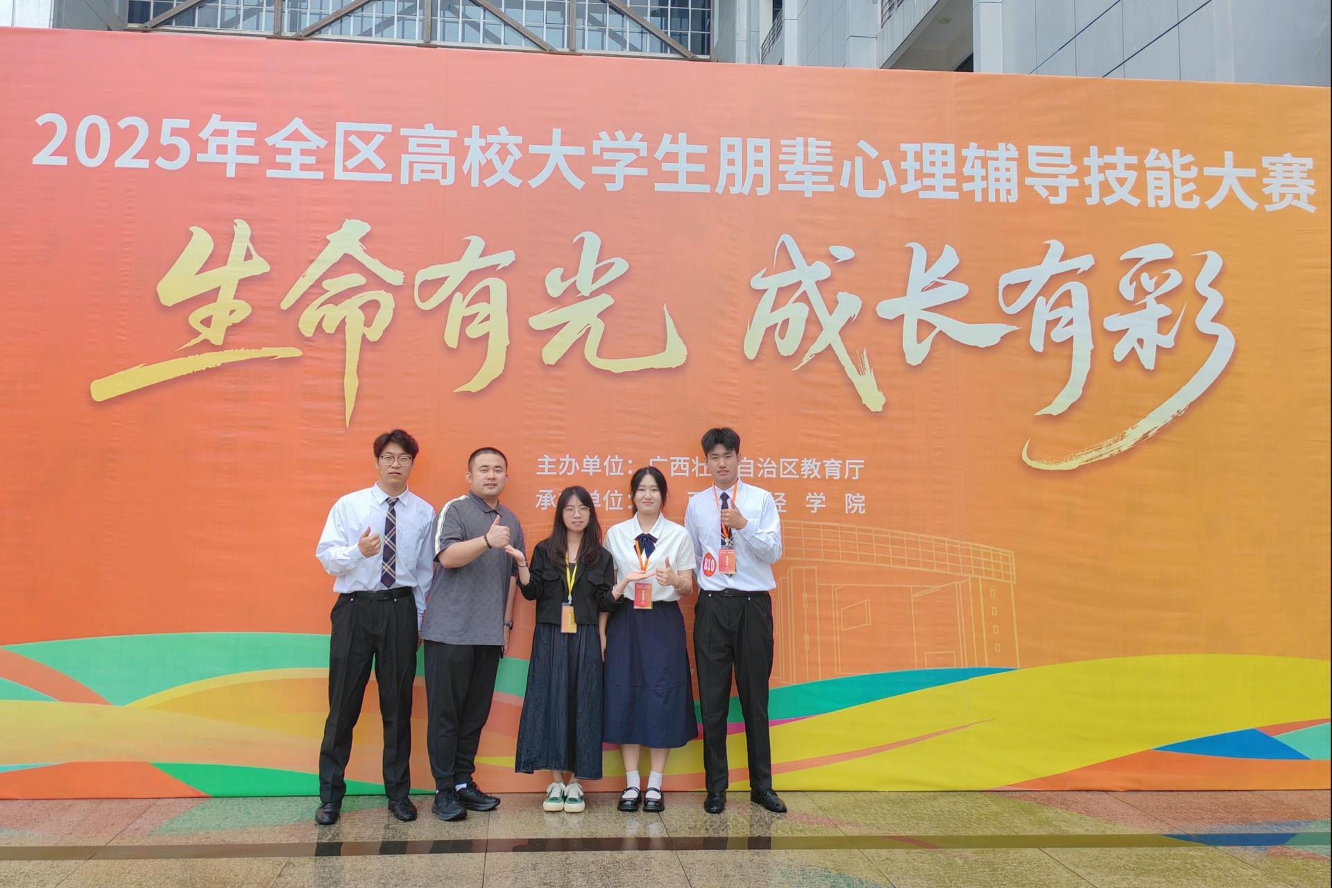 5月23日至24日,由广西壮族自治区教育厅主办的“2025年全区高校大学生朋辈心理辅导技能大赛”决赛在广西财经学院圆满落幕。beat365官方网站代表队凭借扎实的专业知识和出色的现场表现,荣获大赛三等奖,展现了学校心理健康教育的优秀成果。