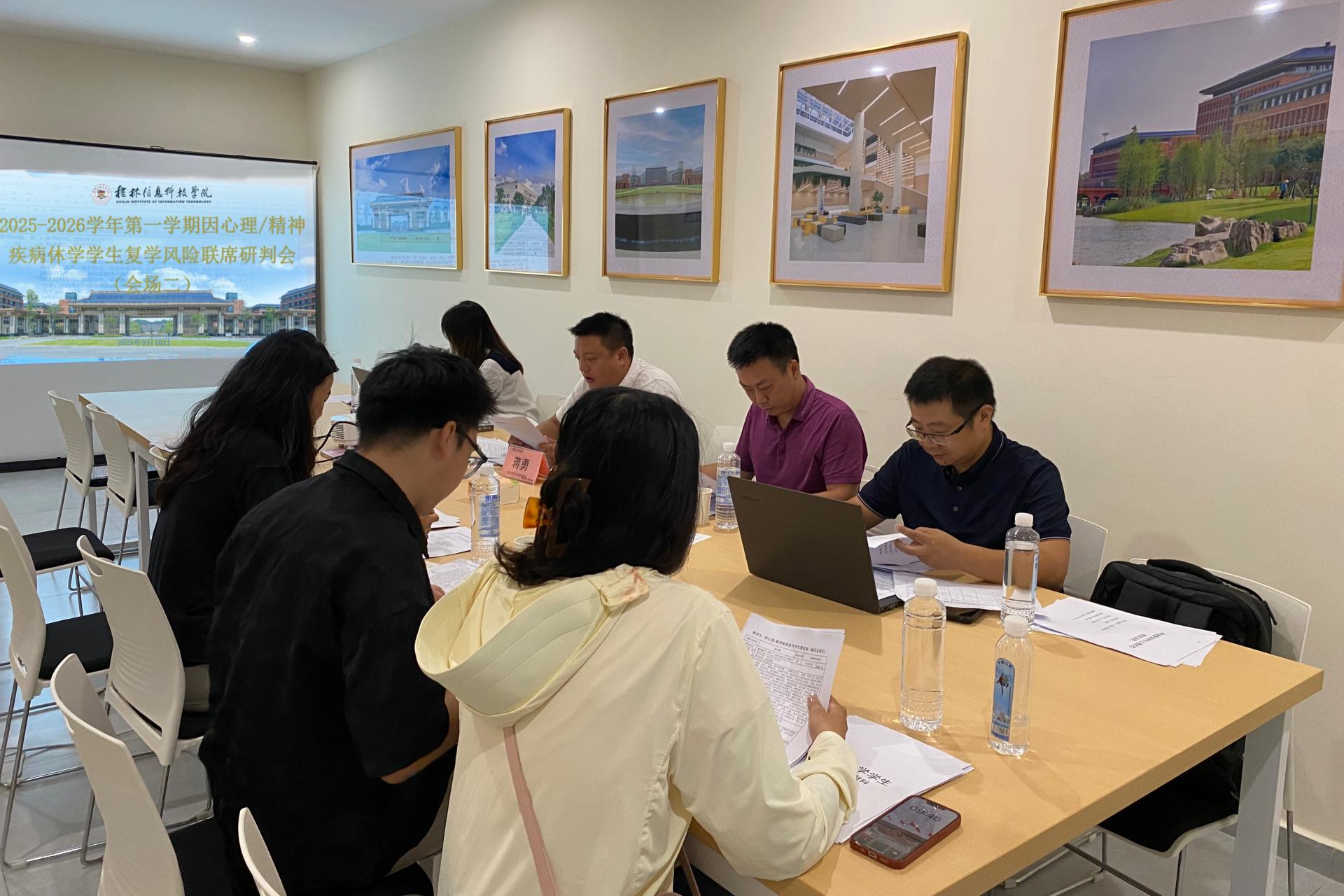 会议特邀桂林市社会福利医院何雪雪和王锦能两位副主任医师提供专业指导。首先,各二级学院党委副书记及学工办主任就本院因心理/精神疾病休学学生的总体情况、复学准备工作及学院层面支持措施进行了汇报,体现各学院对学生心理健康工作的高度重视与组织落实。随后,学院心理辅导员及相关学生辅导员逐一对申请复学学生的具体情况进行说明,包括休学期间学生的治疗过程、当前状态、家庭支持、学业压力应对能力等,为风险评估提供了详实的依据。在专家评估环节,何雪雪主任、王锦能主任结合临床经验与个案材料,从专业角度对每位学生的复学风险进行了分析,并提出了针对性干预建议,包括定期随访、药物管理、心理支持及危机预警机制建设等,为学校下一步工作提供了重要参考。最后,与会人员学生实际和校园管理要求,综合判断复学风险等级,并初步制定后续跟踪帮扶方案。