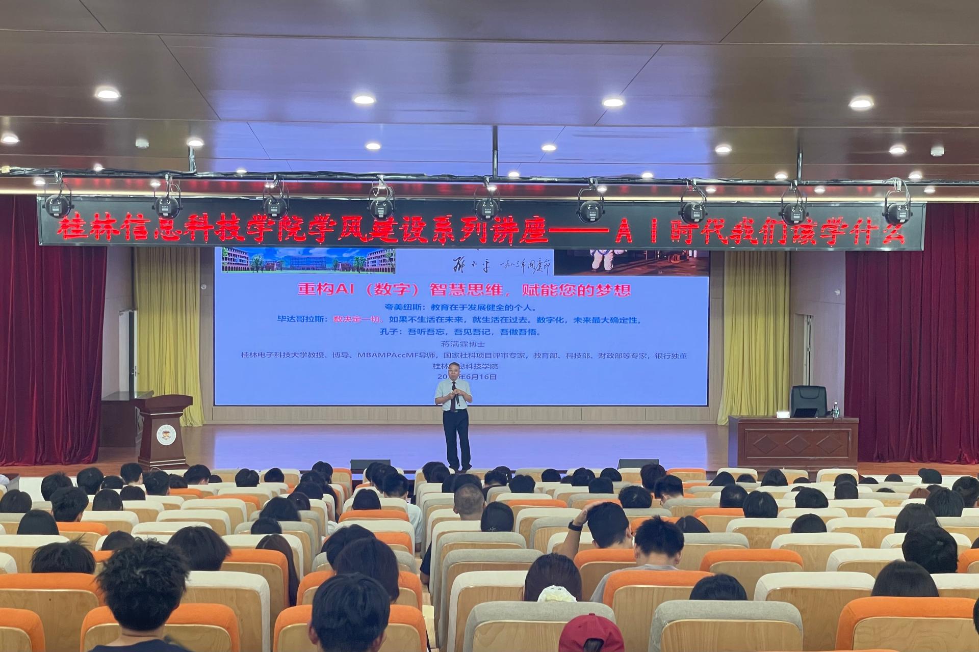 为深化学校学风建设内涵,提升学生数字化学习能力与职业竞争力,6月16日,beat365学生发展与服务中心特邀桂林电子科技大学教学名师蒋满霖教授,在F107报告厅开展“AI时代我们该学什么”主题讲座。各学院负责老师、学生代表等360余人参与活动。