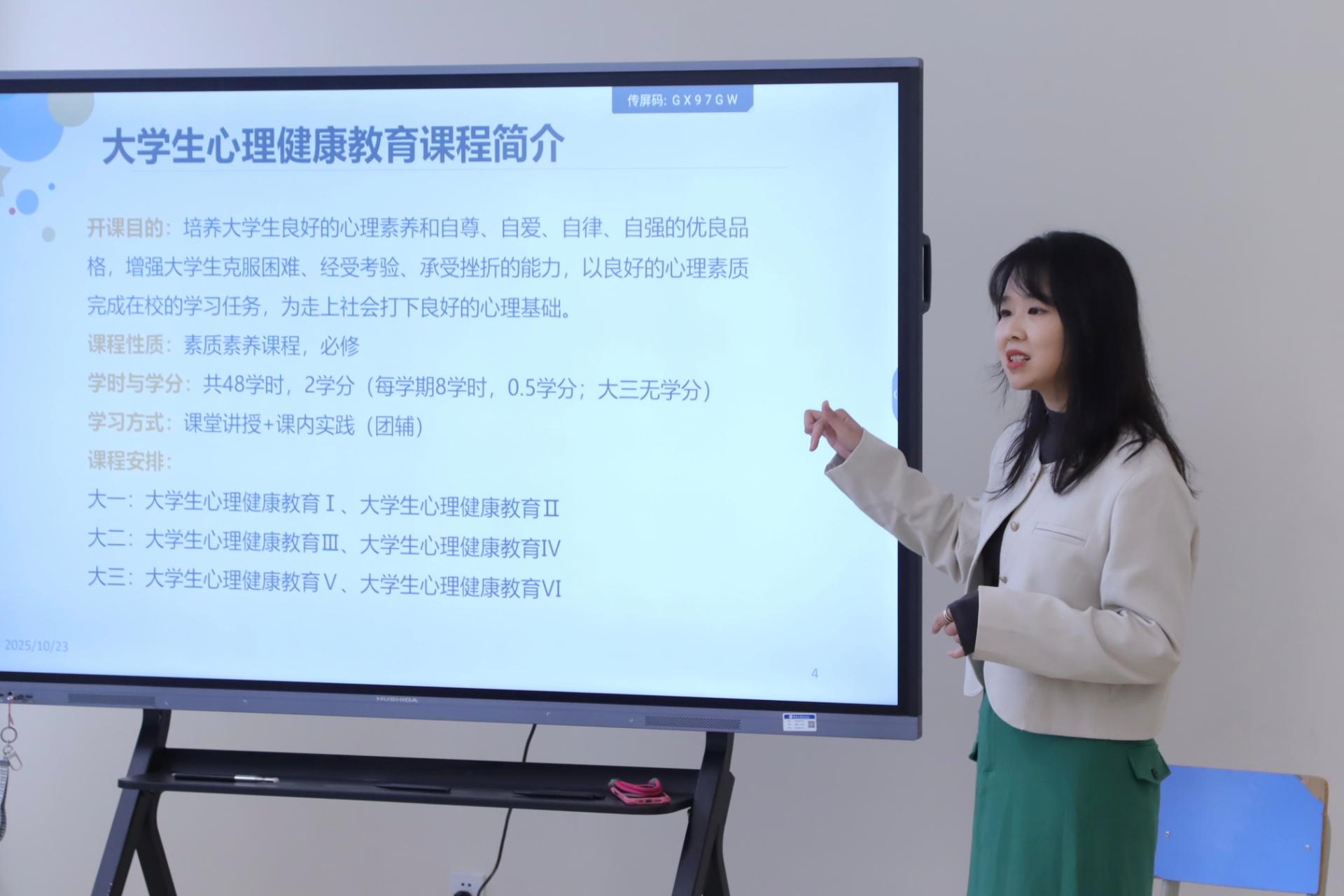 本次备课会围绕“课程简介”、“教学大纲解读”、“教学参考材料”和“心理实训室管理”四个核心内容展开。李芃默老师首先对《大学生心理健康教育》课程的整体设置进行了详细介绍。该课程作为全校性素质素养必修课,贯穿大一至大三,共计48学时、2学分,旨在通过“课堂讲授+课内实践”相结合的方式,培养学生良好的心理素养和健全人格,增强其应对困难与挫折的能力,为未来步入社会奠定坚实的心理基础。