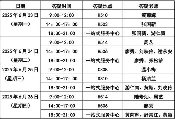 为帮助大家更好地复习备考,基础教研部联合学生发展与服务中心于2025年6月23日至6月26日在“一站式”学生服务中心多功能厅安排《高等数学11》期末答疑活动。具体安排如下: