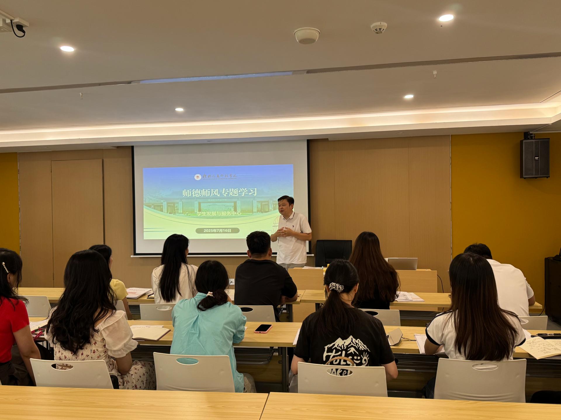 为加强新时代教师队伍建设,7月16日,学生发展与服务中心在一站式学生社区多功能厅组织开展师德师风专题学习会。学校纪委书记、校长助理、学生发展与服务中心主任周璇领学,学生发展与服务中心全体教师参加学习。