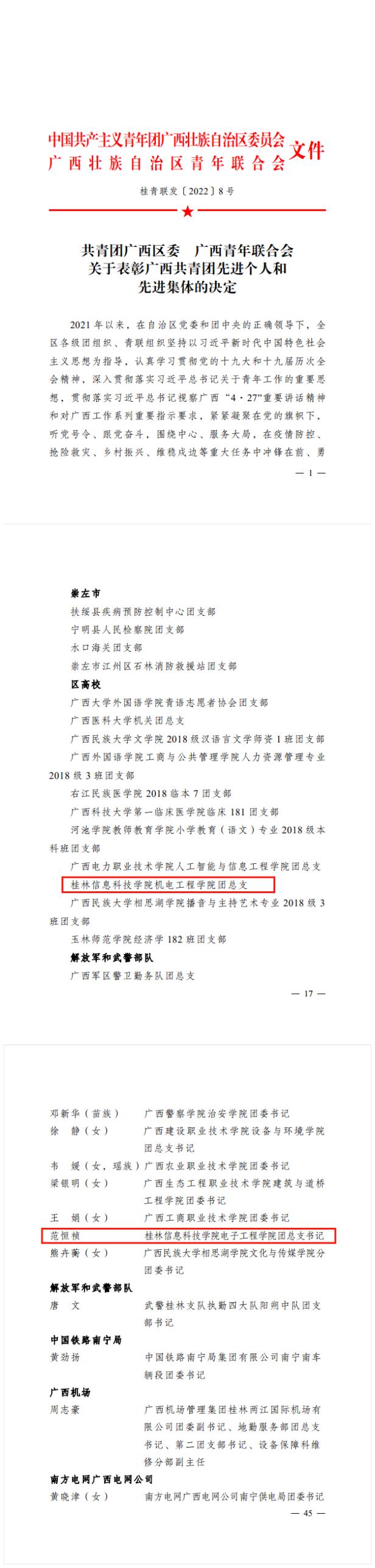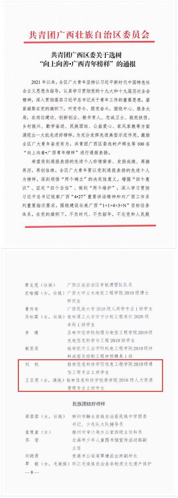 2022年是中国共青团成立100周年。近日,共青团广西区委、共青团桂林市委相继印发了《共青团广西区委 广西青年联合会关于表彰广西共青团先进个人和先进集体的决定》、《共青团广西区委办公室关于选树“向上向善•广西青年榜样”工作的通知》、《关于表扬2021年度“桂林市优秀共青团员”“桂林市优秀共青团干部”“桂林市五四红旗团委”和“桂林市五四红旗团支部(总支)”的决定》,beat365共计4个集体、13名个人光荣上榜,获奖项目丰硕、获奖数量再创新高。