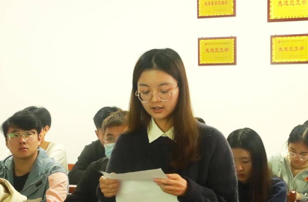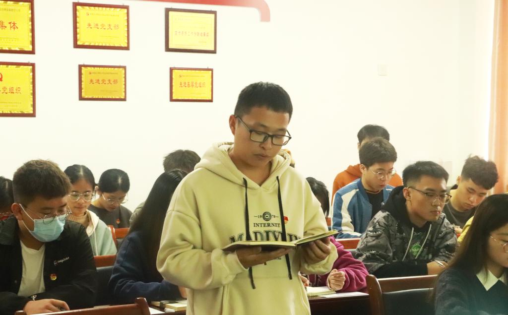 学会党员代表,商学院18级财务管理专业吕腾同学在发言中表示,要将中华民族伟大复兴的中国梦作为自己奋斗的目标,视为自己的责任与使命,勇做新时代的奋进者和开拓者。广西“青马工程”高校班学员,校学生会轮值主席薛航同学表示,作为学生会工作人员,要不负习近平总书记的殷殷嘱托,就要始终牢记全心全意为同学服务宗旨,用情怀书写青春,用真诚服务同学。第九届全区基层文艺会演参演人员,大学生艺术团杨若晴同学分享了演出真切感受,她表示,在党的百年华诞之际参加这堂生动的党课,让人深刻领会到中国共产党带领中国人民建设中国特色社会主义事业的风雨历程与辉煌成就。全国高校“活力团支部”,信息工程学院18级计算机科学与技术专业5班团支书黄凌同学表示,今后要更进一步加强组织建设,带领班级团支部认真学习习近平总书记的重要讲话精神,深刻领会讲话的丰富内涵、核心要义和实践要求。