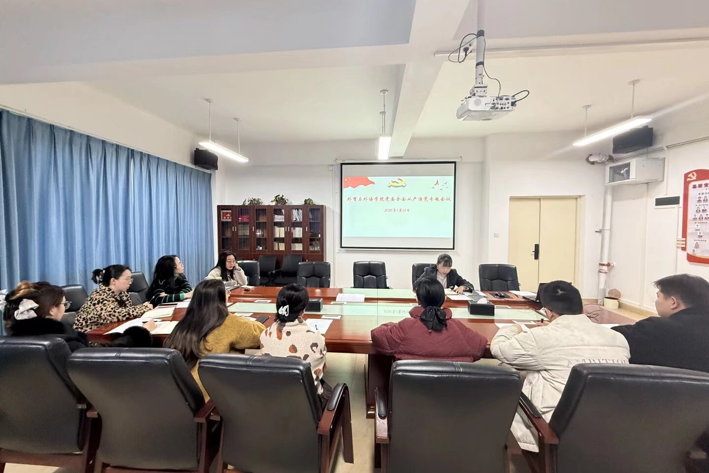 外贸与外语学院党委召开2026年上半年全面从严治党工作会议为深入贯彻新时代党的建设总要求,扎实推进全面从严治党向纵深发展,1月16日,外贸与外语学院党委在L710会议室召开2026年上半年全面从严治党工作会议。会议由学院党委书记廖星男主持,学院全体党委委员参会。会...