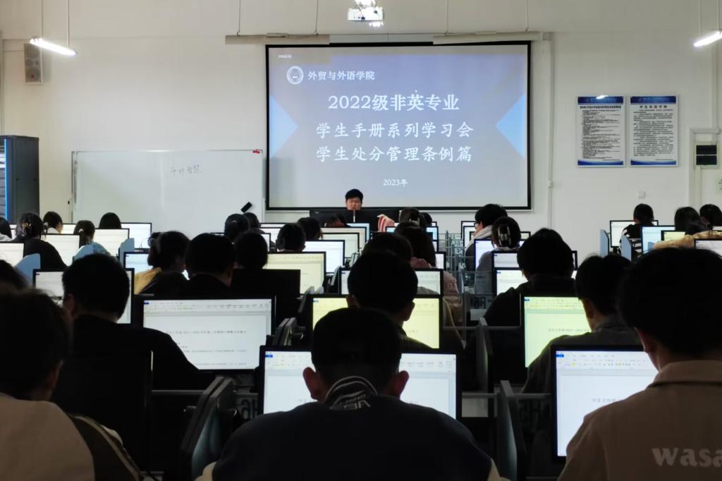 外贸与外语学院组织开展《beat365官方网站学生违纪处分办法》专题学习会为规范学生行为举止、加强校园管理,3月29日,外贸与外语学院于51304多媒体教室开展《beat365官方网站学生违纪处分办法》专题学习会,会议由2022级辅导员杨锦超领学,2022级全体学生共同学习。会上,在辅导员杨...