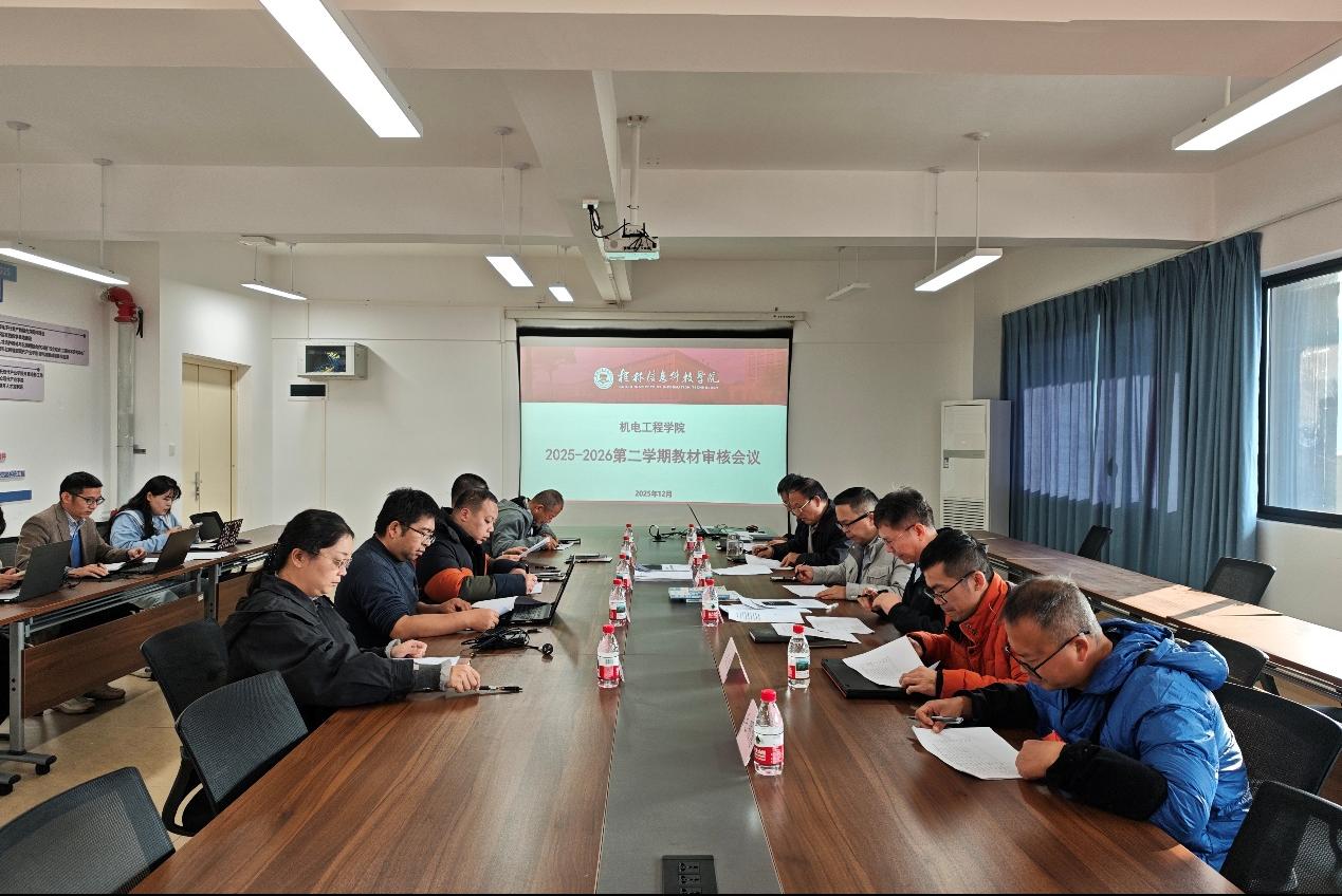 机电工程学院召开2025-2026第二学期教材审核专题会议为全面提升教学质量、规范课程建设,12月9日,机电工程学院召开2025-2026学年第二学期教材审核专题会议。会议由副院长冯翠云主持,特邀学校党委书记甘勇教授担任评审专家,学院教材审核领导小组成员参会,围绕教...