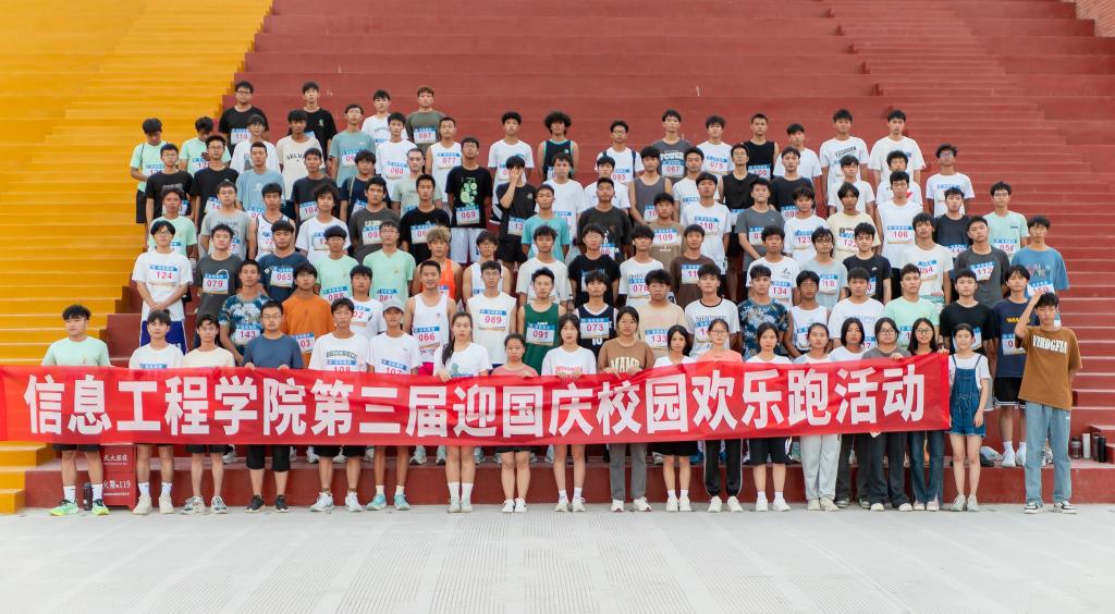 喜迎国庆,奔跑向未来,9月27日下午,信息工程学院在学校操场举办第三届迎国庆校园欢乐跑活动,师生们以跑步的方式给祖国庆生。本次活动由我院分团委组织策划,全院跑步爱好者参加。