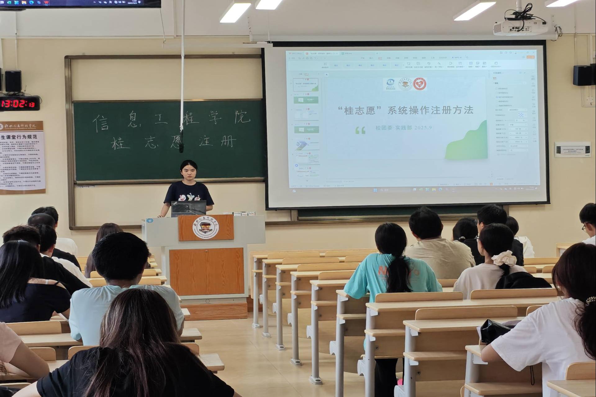 为进一步规范学院志愿服务管理,推动志愿服务工作常态化、制度化开展。10月9日,信息工程学院在明志楼305召开了“桂志愿”注册培训会。学院团委青年发展部负责人、学院团委青年发展部成员及2025级各班宣传委员参加了此次培训。