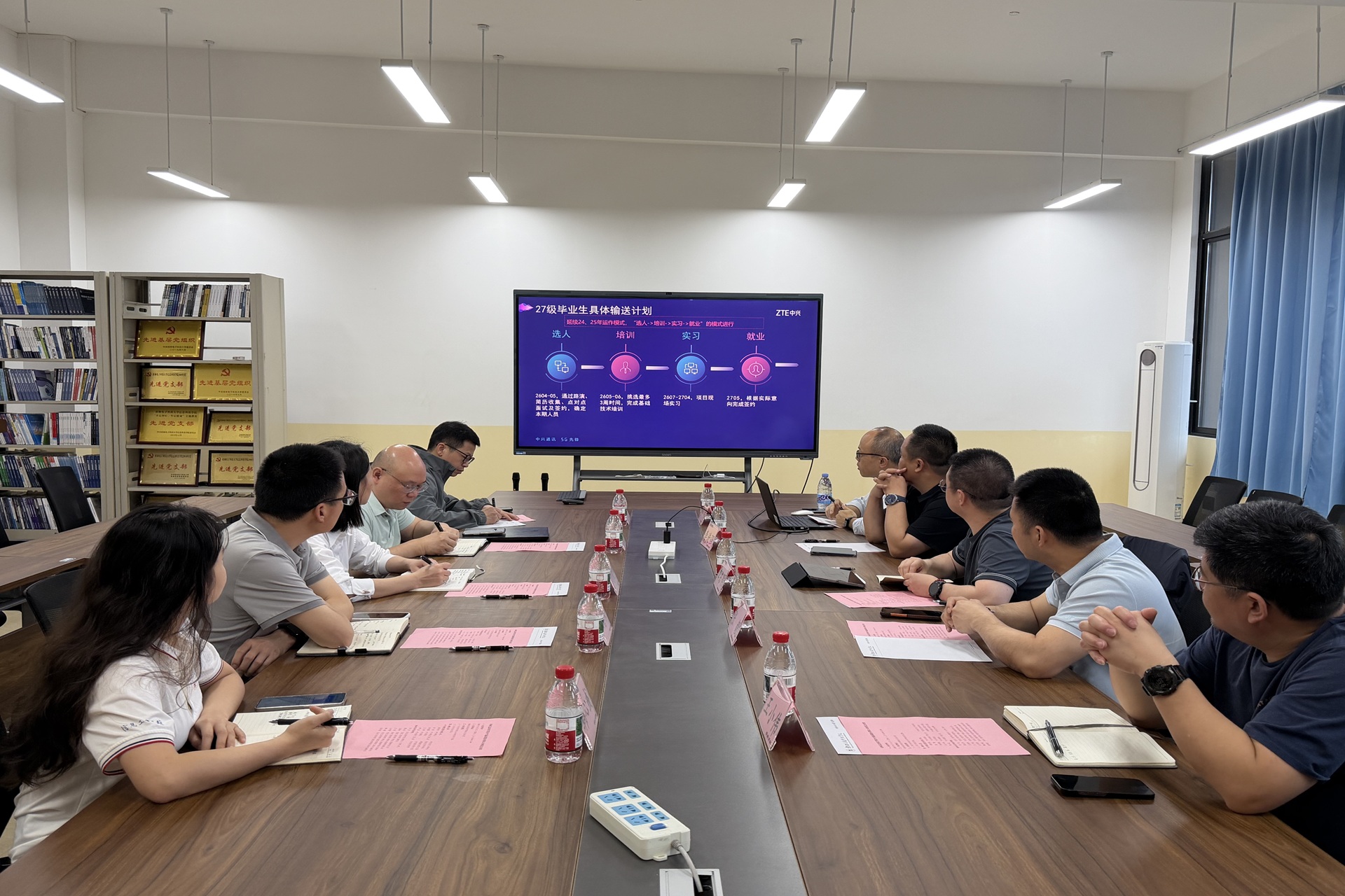 会上,中兴通讯谭东伟科长回顾了校企合作历程,就提升学生参与意愿、优化培养模式等后续工作方向提出建议。周磊经理详细介绍了定制化人才培养方案,双方围绕岗位需求、薪酬待遇等内容深入研讨,共同探索“2.5+0.5+1”协同培养新模式,并就师资培训、教材共创等产教融合重点工作达成共识。莫永华副院长通报了学院2023级学生整体情况,双方就校企教师交流、教师企业实习、联合开发特色教材等合作方向细化了落地举措。会议最后,刘欣副院长做总结发言,对中兴通讯的支持表示感谢,充分肯定本次合作成果,并表示学院将全力推进各项合作落地,持续深化产教融合,以师资能力提升、优质教材建设为抓手,全面提升人才培养质量与学生就业竞争力。