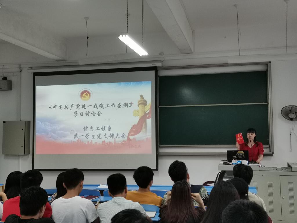 为深入学习贯彻习近平总书记系列重要讲话精神,6月11日,信息工程系第一、第三学生党支部学习《中国共产党统一战线工作条例》,本次会议由信息工程系第一党支部书记廖星男老师主持。