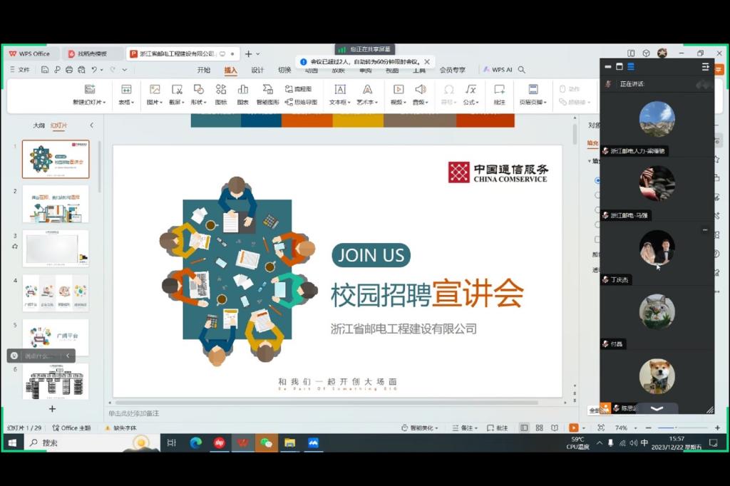 为持续推进我院就业工作,促进学生高质量就业,12月20日至22日期间,中兴生态圈企业——南京顺盛通信科技有限责任公司、南京兴晟泽信息技术有限公司、福建省鸿官通信工程有限公司、浙江省邮电工程建设有限公司通过腾讯会议对我院2024届毕业生开展了四场空中宣讲会。宣讲会吸引了众多学生的参与,为学生提供了与企业面对面交流的机会。