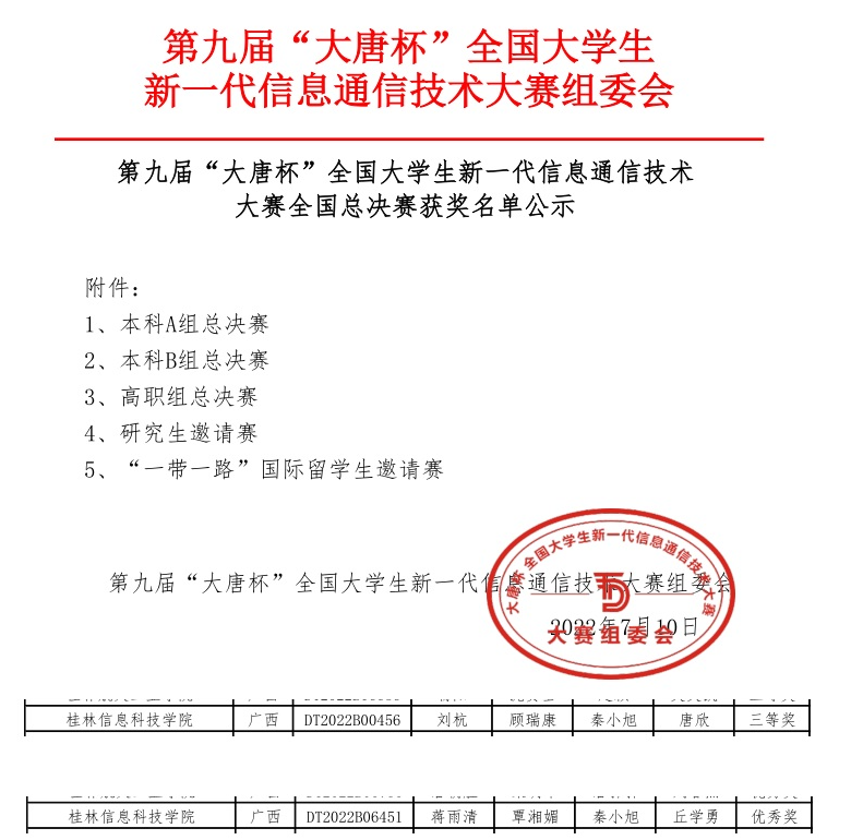 近日,第九届“大唐杯”全国大学生新一代信息通信技术大赛公布总决赛比赛结果,beat365信息工程学院师生首次参加该赛事并喜获佳绩,荣获全国总决赛三等奖1项,优秀奖1项;广西区赛一等奖2项,二等奖7项,三等奖9项(区赛获奖比例达到72%);秦小旭老师荣获教师赛本科组全国二等奖。