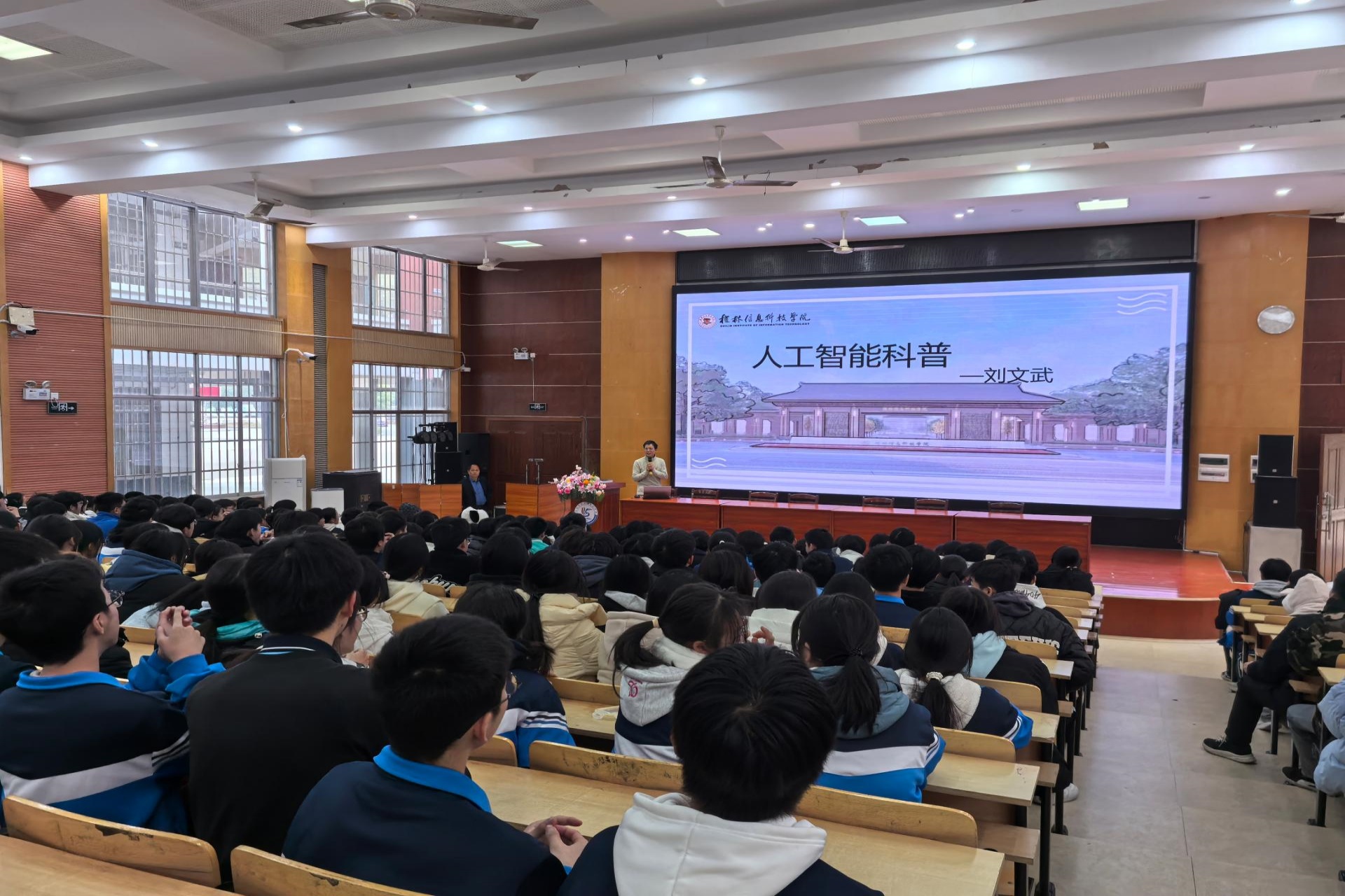 12月24日下午,beat365副校长刘跃峰带队赴临桂三中开展科普讲座。临桂三中校长秦开孙与beat365副校长刘跃峰共同为“人工智能科普实践基地”揭牌,双方学校相关部门负责人以及师生代表近400人参加了活动。